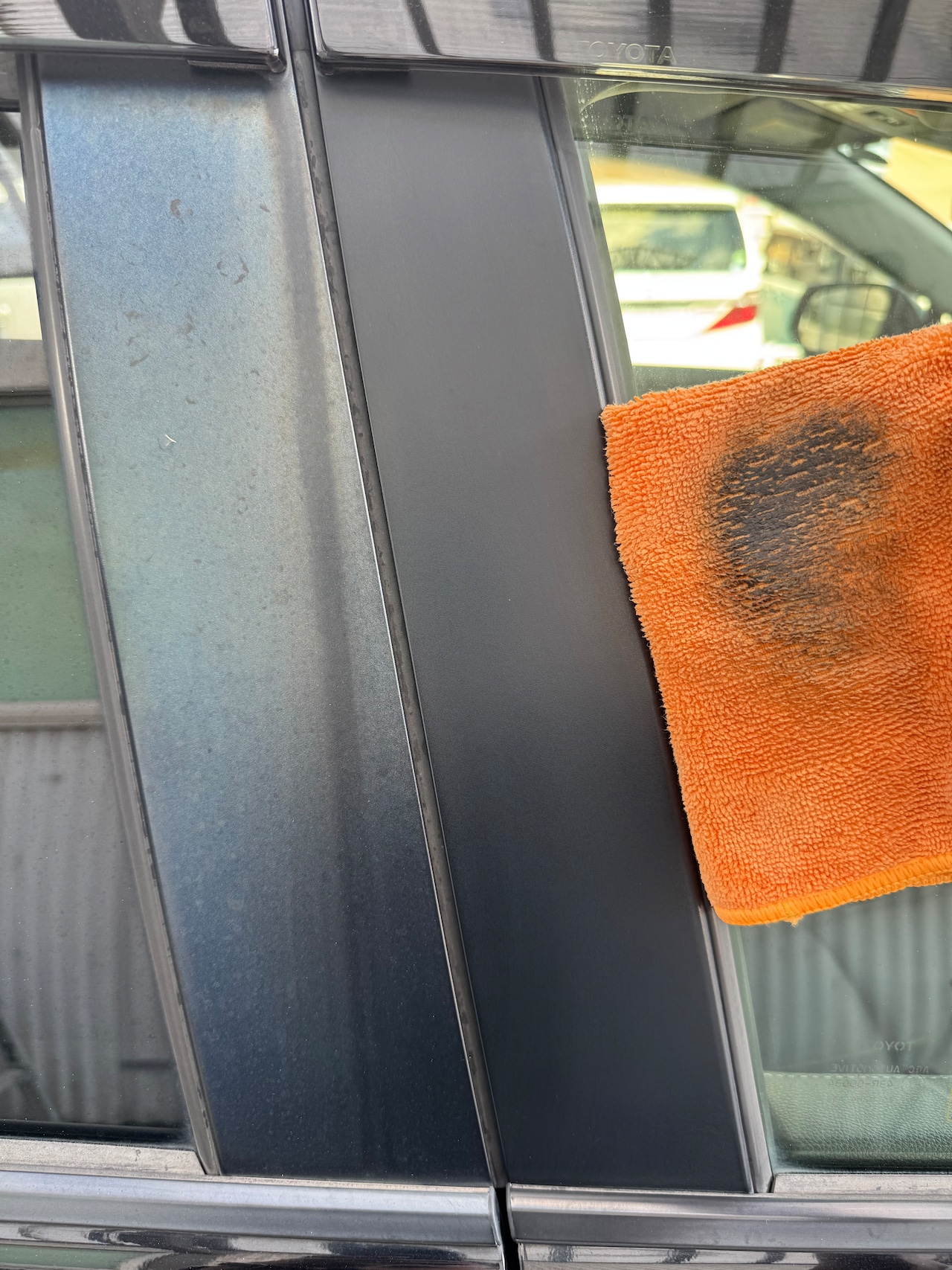 3、汚れやピッチタールが酷い場所は、ゆっくりクリーナーを馴染ませ汚れを溶かす様に拭き取って下さい。強く擦ると傷が入るリスクがあります。